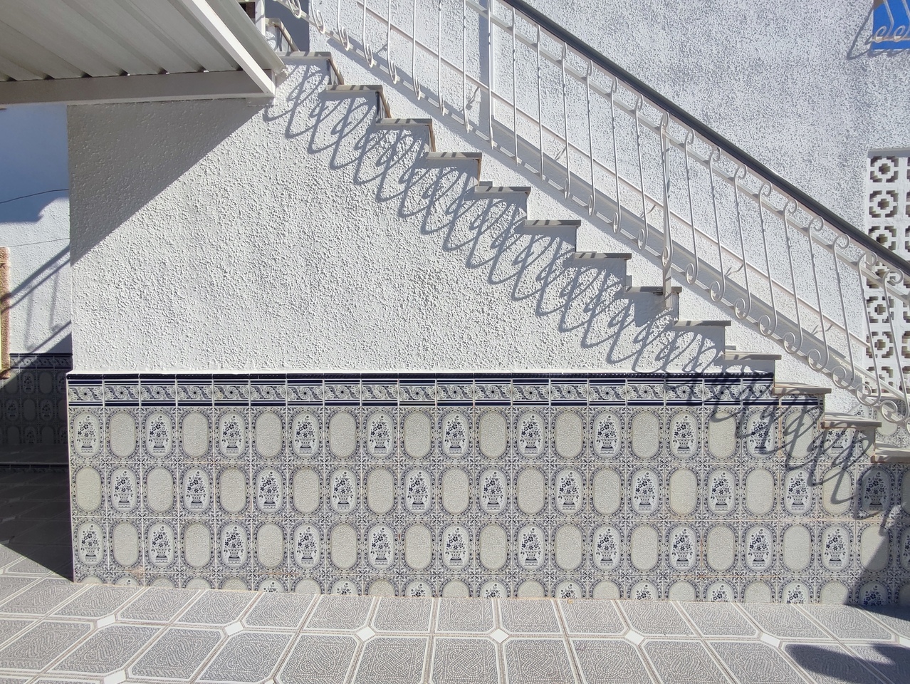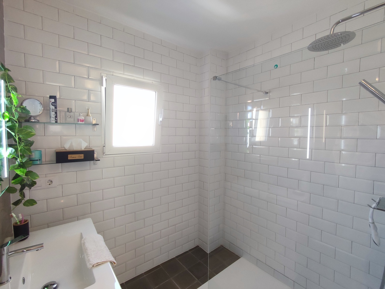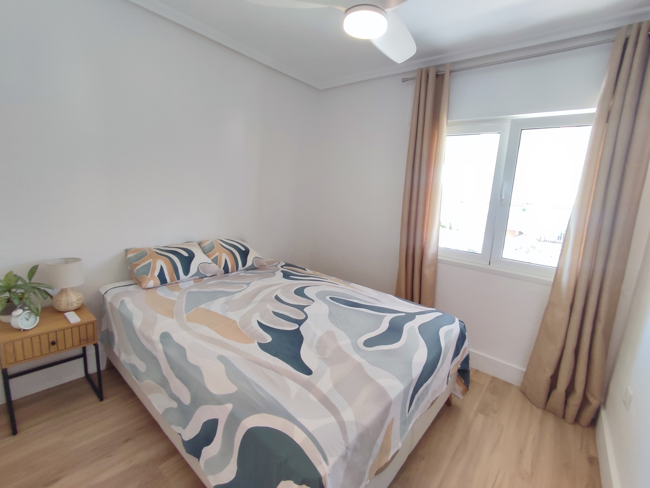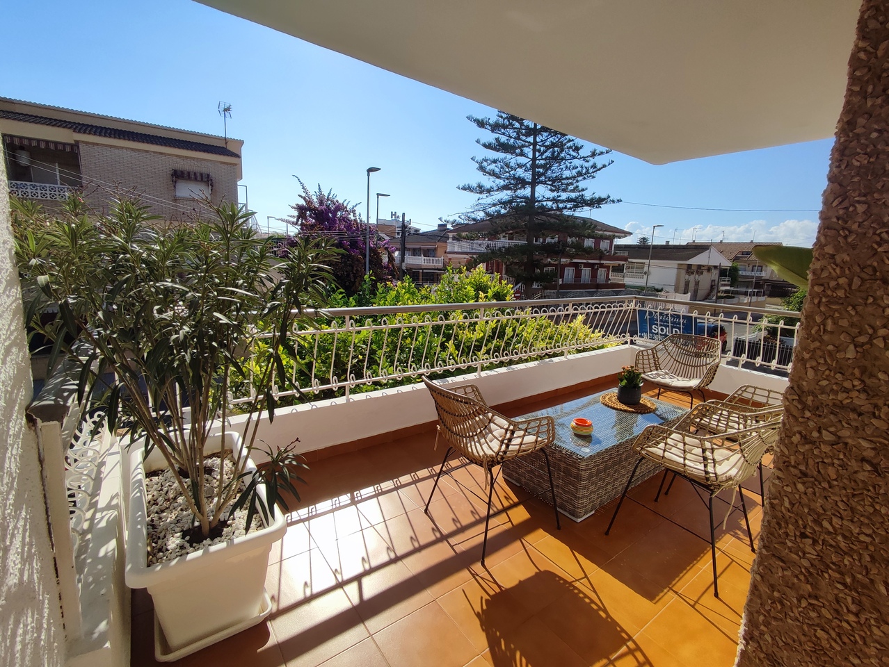 This modern top floor apartment is located in a prime location just 200 meters to Los Narejos beach, close to all amenities and only a 5 minutes drive to the popular tourist resort of Los Alcazares with its excellent selection of bars and restaurants. Completely renovated throughout, the spacious apartment has a seperate stylish open kitchen complete with all new appliances.The lounge is tastefully decorated and includes ceiling fan, hot & cold air conditioning and a new pellet stove. The sunny terrace is perfect for watching the world go by and al fresco dining.The apartment has 3 bedrooms, 1 bathroom with walk in shower, plus a seperate toilet.The private outside space is large enough for up to 3 vehicles and has a covered area for various uses.This apartment is being sold furnished and is ready to be move into and start enjoying straight away, either as a holiday home or permanent living.