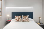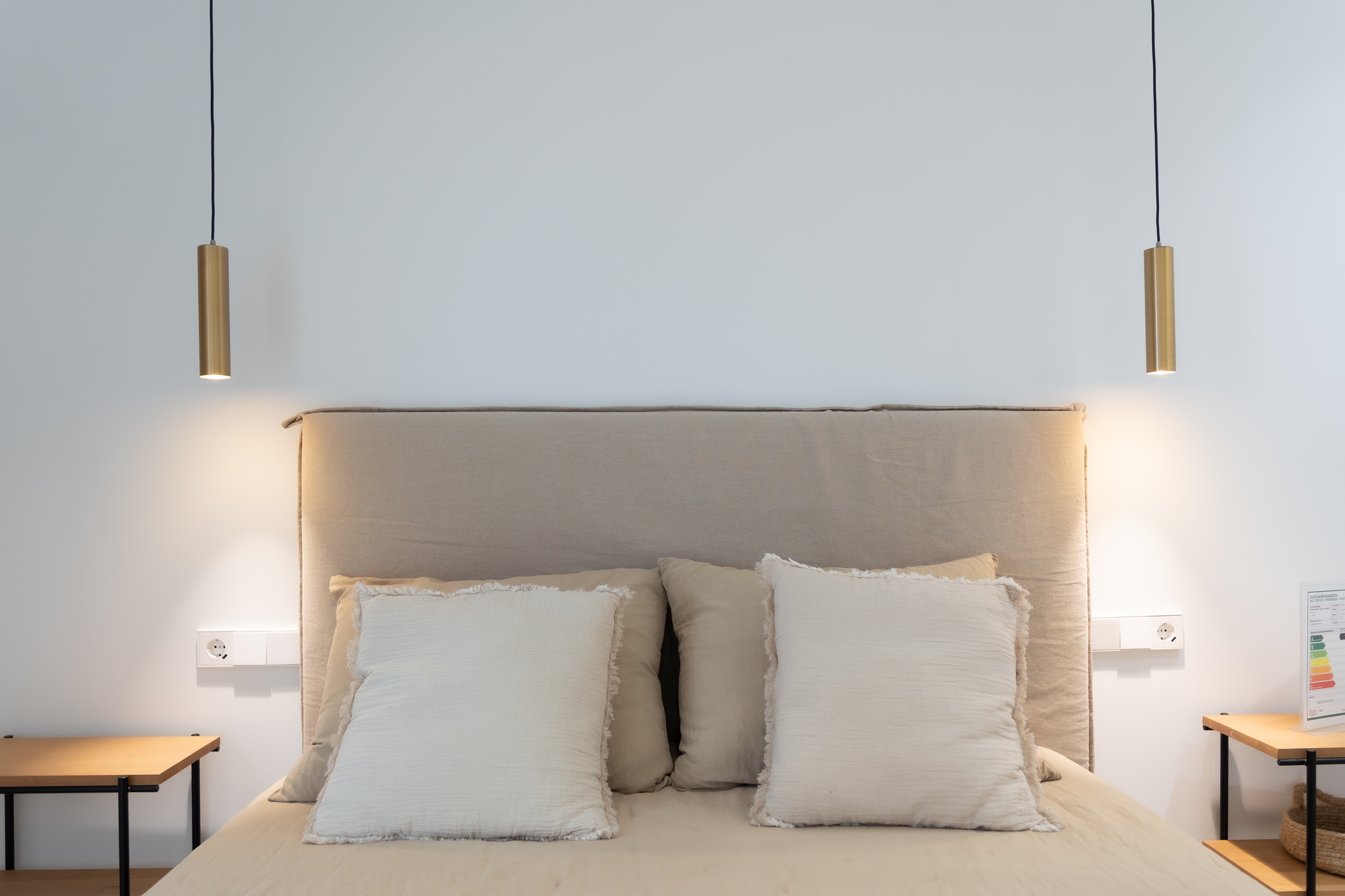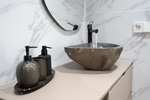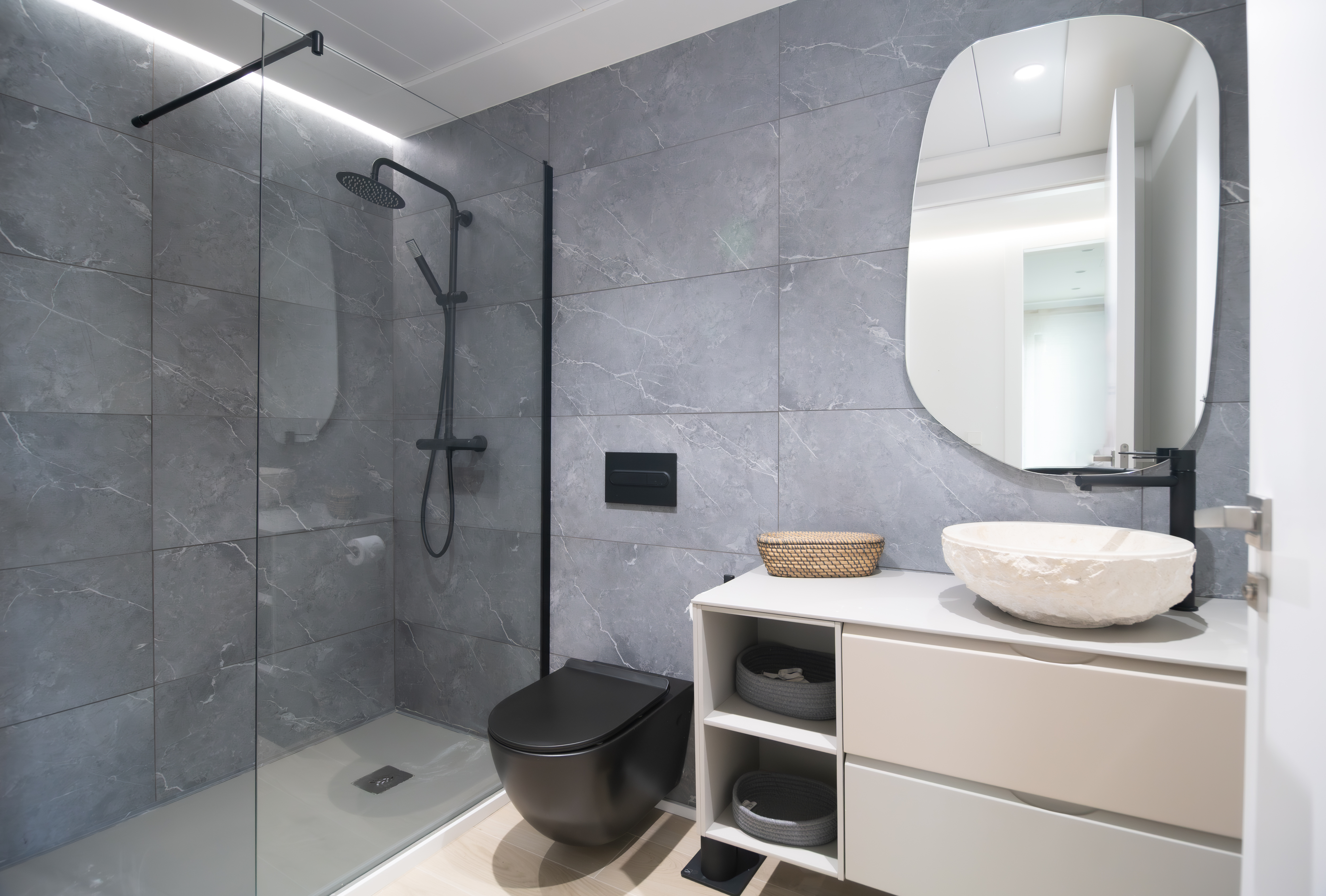 Fully fitted bathrooms with vanity unit, suspended toilet with built-in tank, mirror, rainfall shower and shower screens.