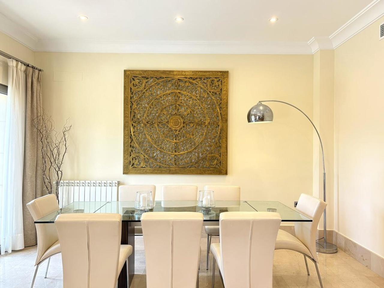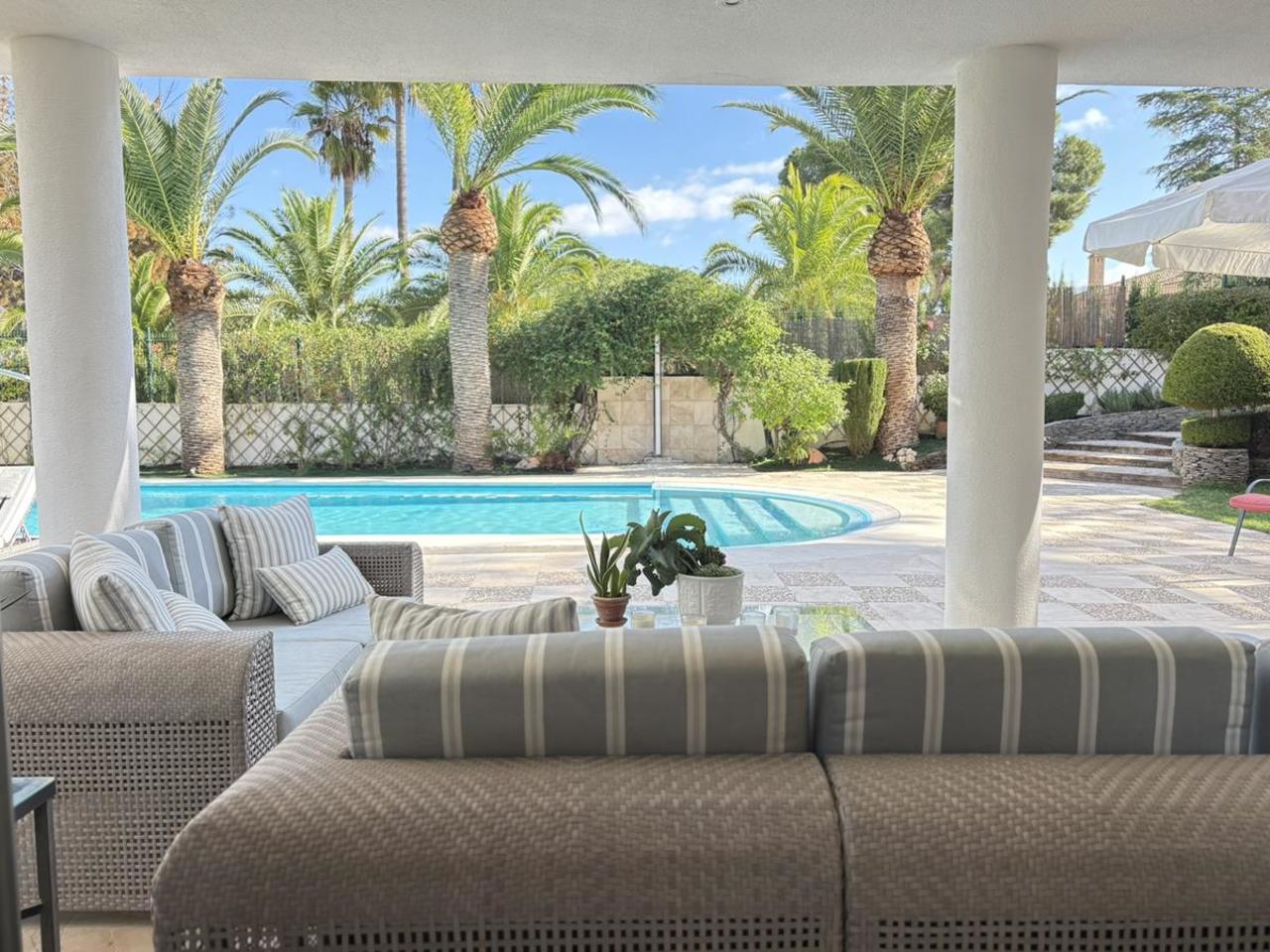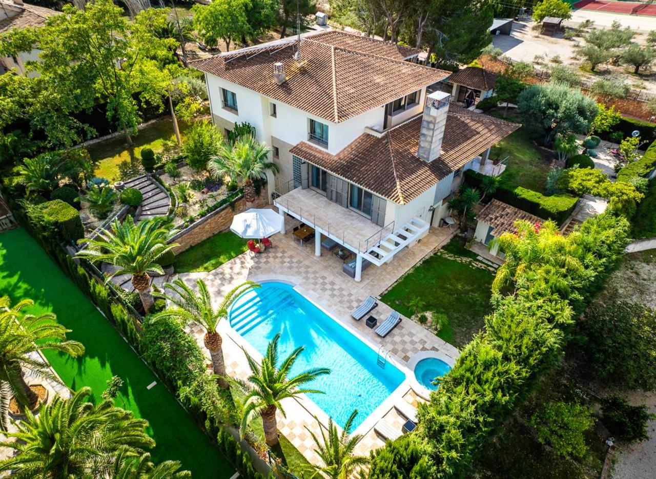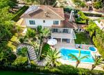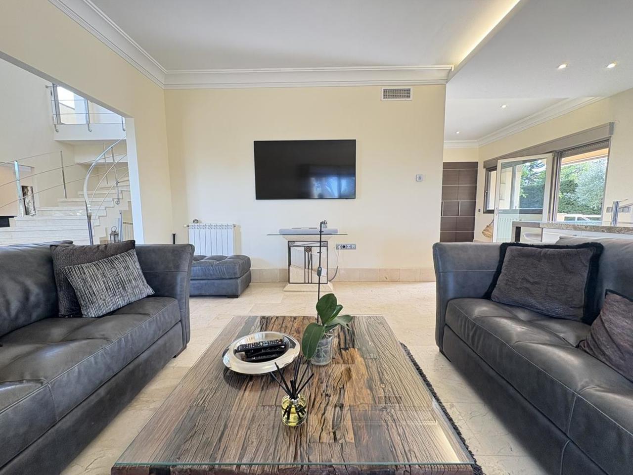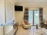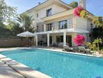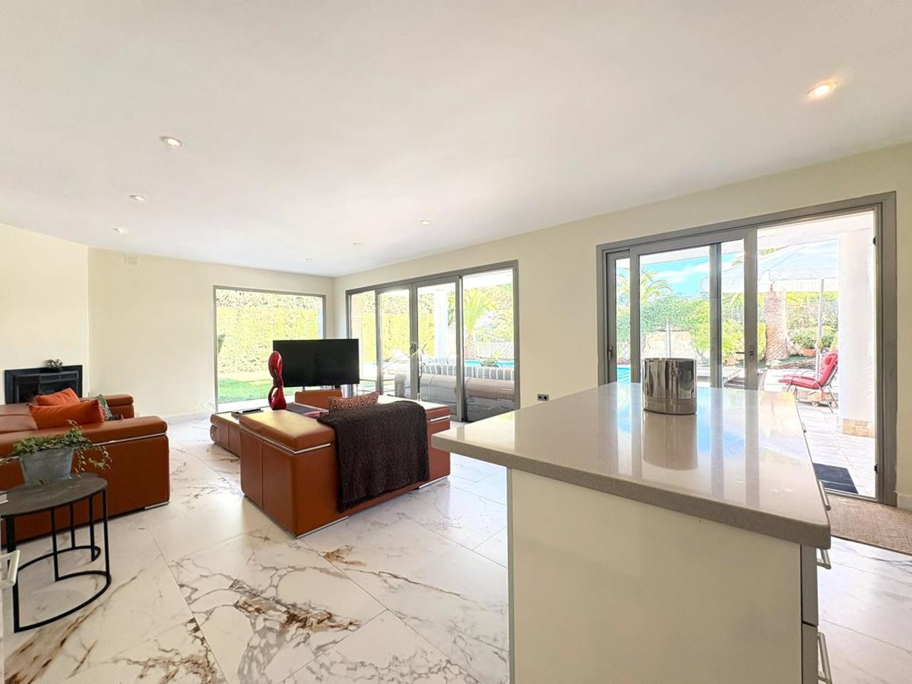 Set within a beautifully landscaped 1,800m² plot, the gardens feature mature pine and palm trees, manicured lawns, and Mediterranean planting that ensures year-round tranquility and privacy. The outdoor living area centers around a 12m x 5m overflow pool with integrated spa, surrounded by elegant terraces ideal for relaxation or entertaining. Exterior changing facilities with shower and toilet add convenience to this resort-style setting.