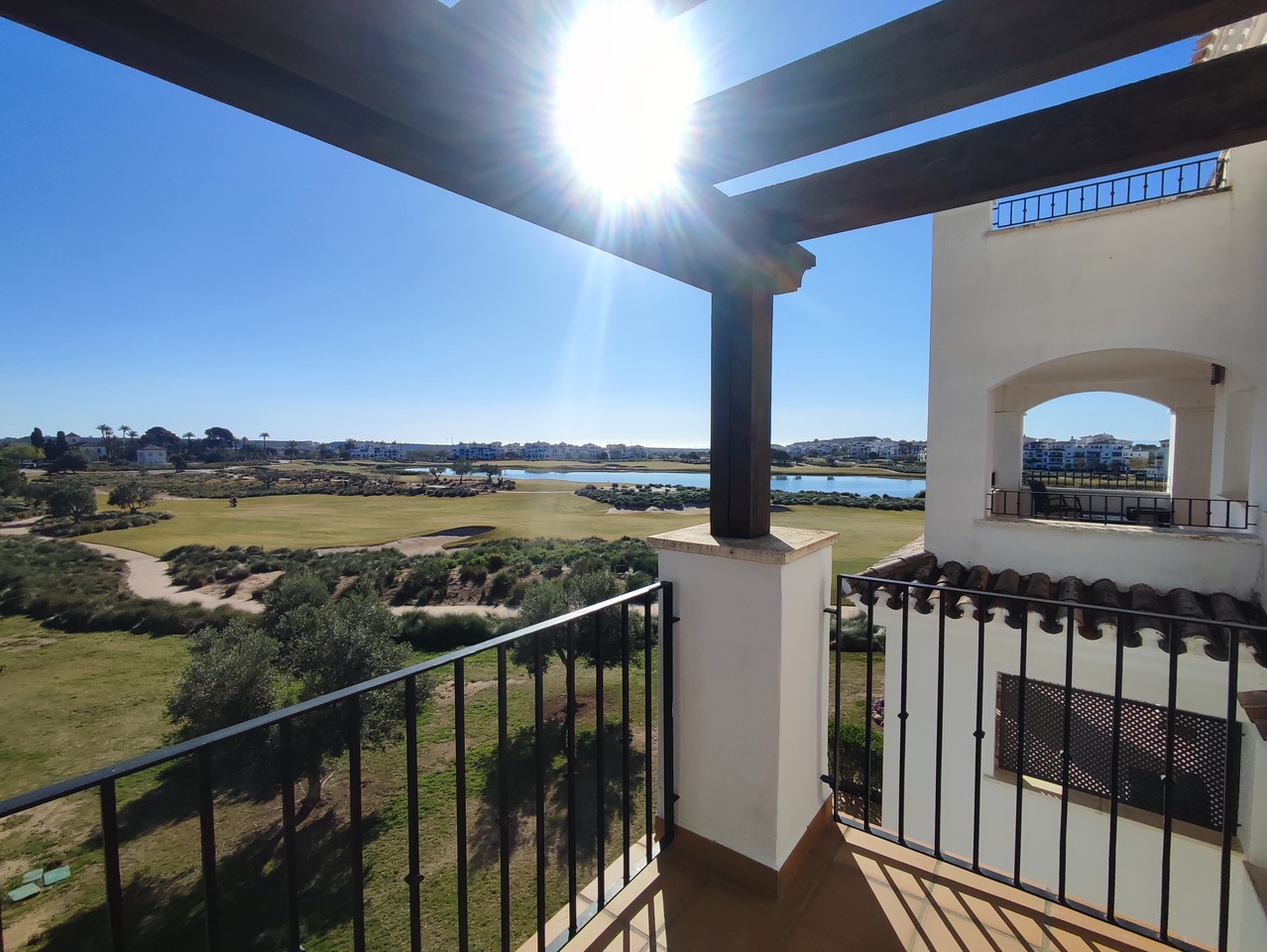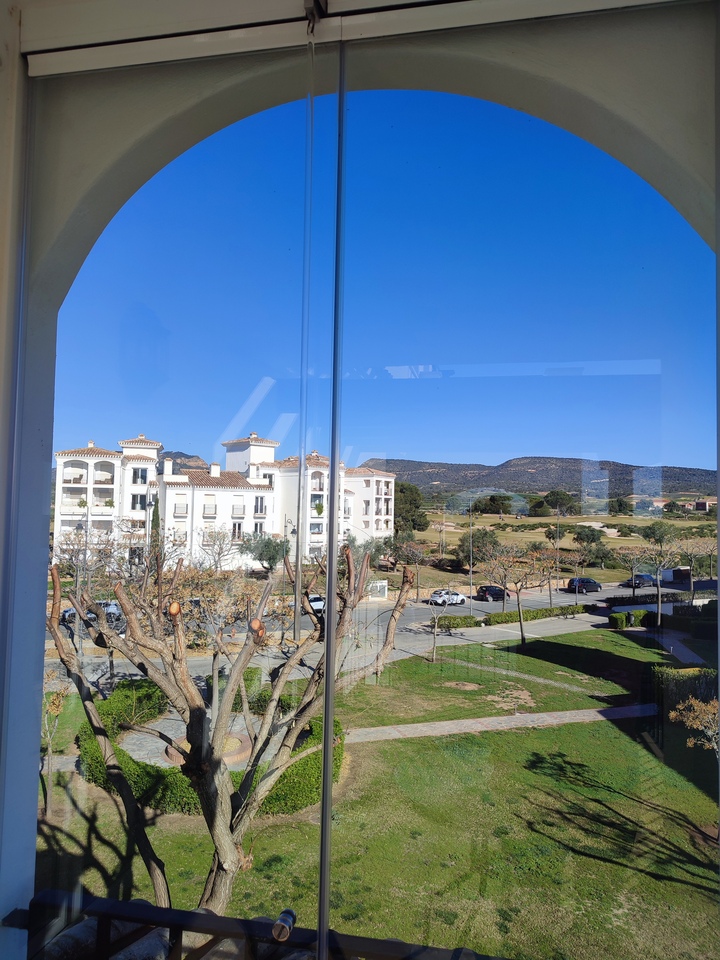This South East facing corner apartment with terrace is in an excellent position only a minutes walk from the resort centre. Situated on the second floor it benefits from a terrace which is half closed (with glass curtains) and half open providing shade and sun. It also has a window in the bathroom. The property has air-conditioning in the living room for summer and central heating for the cooler winter months. There is allocated underground parking with elevator to all levels. The apartment is being sold furnished minus personal possessions. It would make an excellent holiday home or suitable for permanent living.The first thing that impresses you about Hacienda Riquelme Golf Resort is the wide-open spaces, the extensive gardens and the low-density construction, which create a relaxing environment to enjoy a very safe and peaceful life or holiday. The apartments are set out spaciously around the magnificent and challenging 18 hole golf course part of the Jack Nicklaus Golf Trail. In the heart of the resort you will find the beautiful renovated Hacienda where you will find a supermarket, clubhouse, restaurant and bar. The inner court yard becomes the hive of entertainment in the Summer, whilst the large terrace set in the stunning gardens is open all year for “al fesco” dining and drinking.Facilities:Gated Community.24 hour security.“El Cason” Bar, Restaurant, Clubhouse. “Sips” Coffee ShopSupermarket.Summer Entertainment.19 large community swimming pools.Communal gardens.Trees, 5 lakes.Wild flowers & local wildlife.Driving range & Golf ShopTennis courts.Paddle tennis courts.Football / Basketball court.Outside gym area.Children’s play areas.Hacienda Riquelme is very well connected by the main motorways. Murcia Airport (20 mins)Mar Menor beaches (15 mins)Mediterranean beaches (20 mins)For those who like historical buildings, architecture or a desire to shop, the lovely cities of Murcia and Cartagena provide plenty of entertainment. Murcia (30 mins)Cartagena (45 mins) Murcia Airport (20 mins)Near to the bustling popular village of Sucina with shops, restaurants, bars, chemist, supermarket and lots more (5 minutes)For more information on the apartments available please contact us.