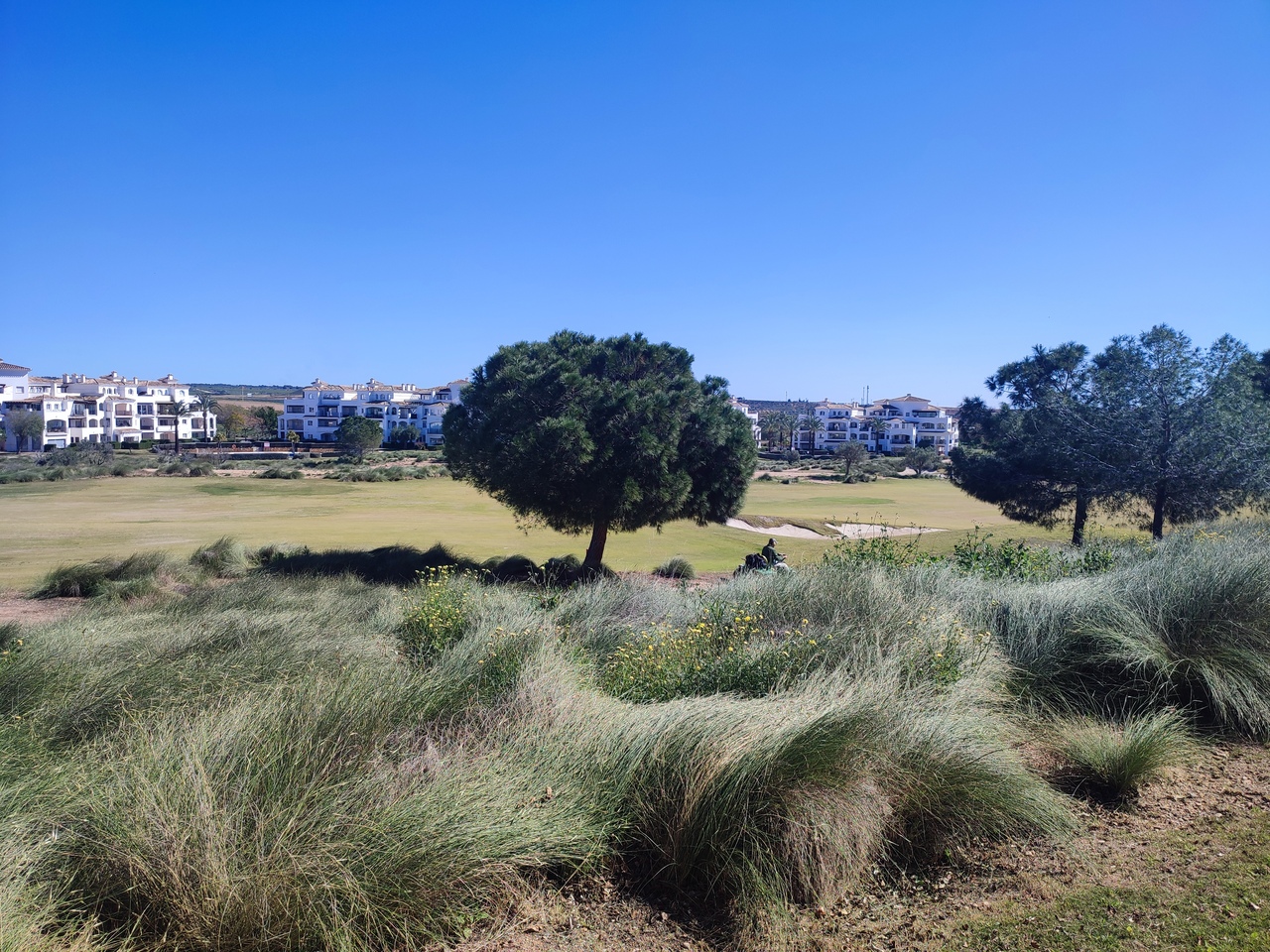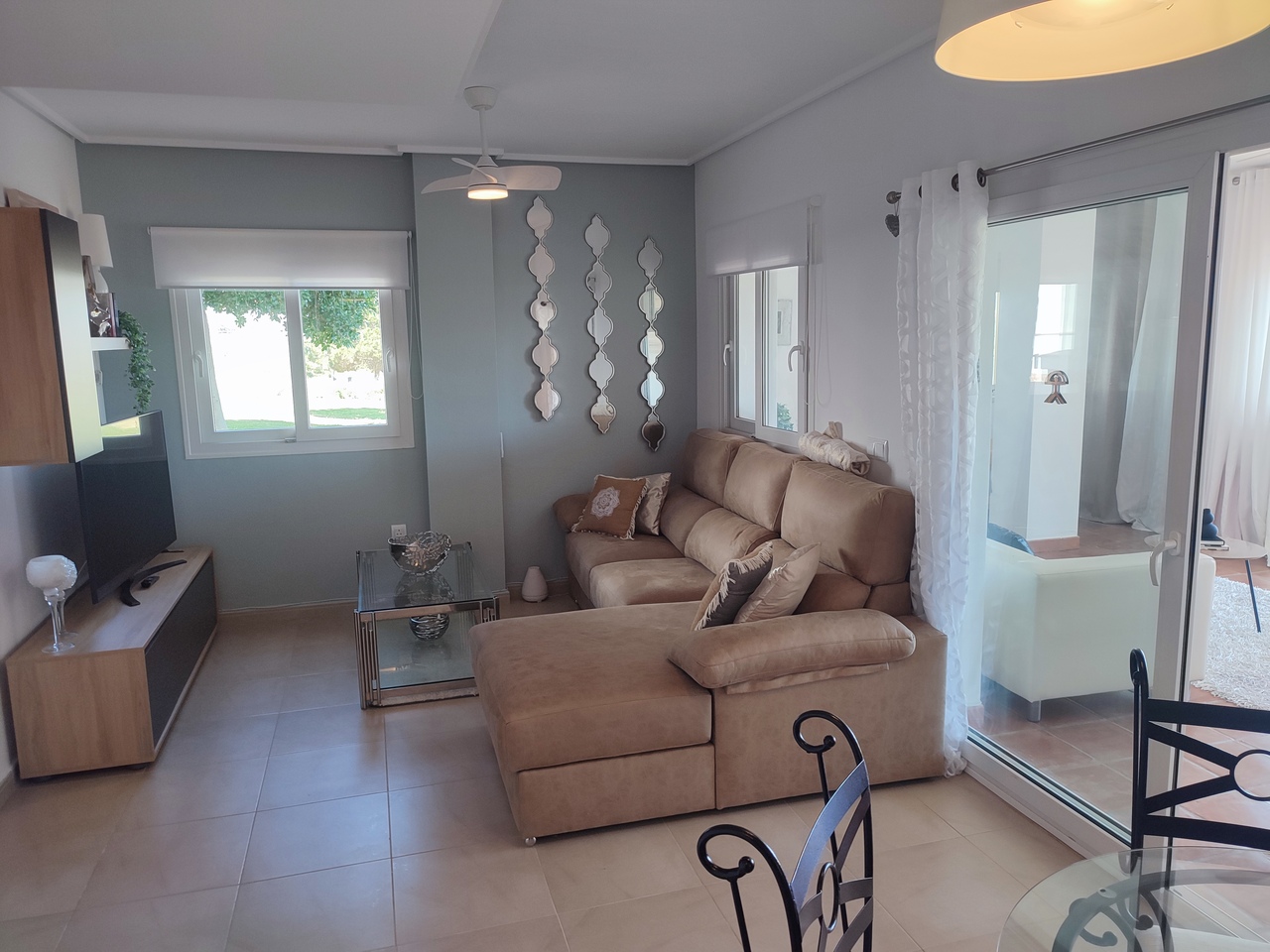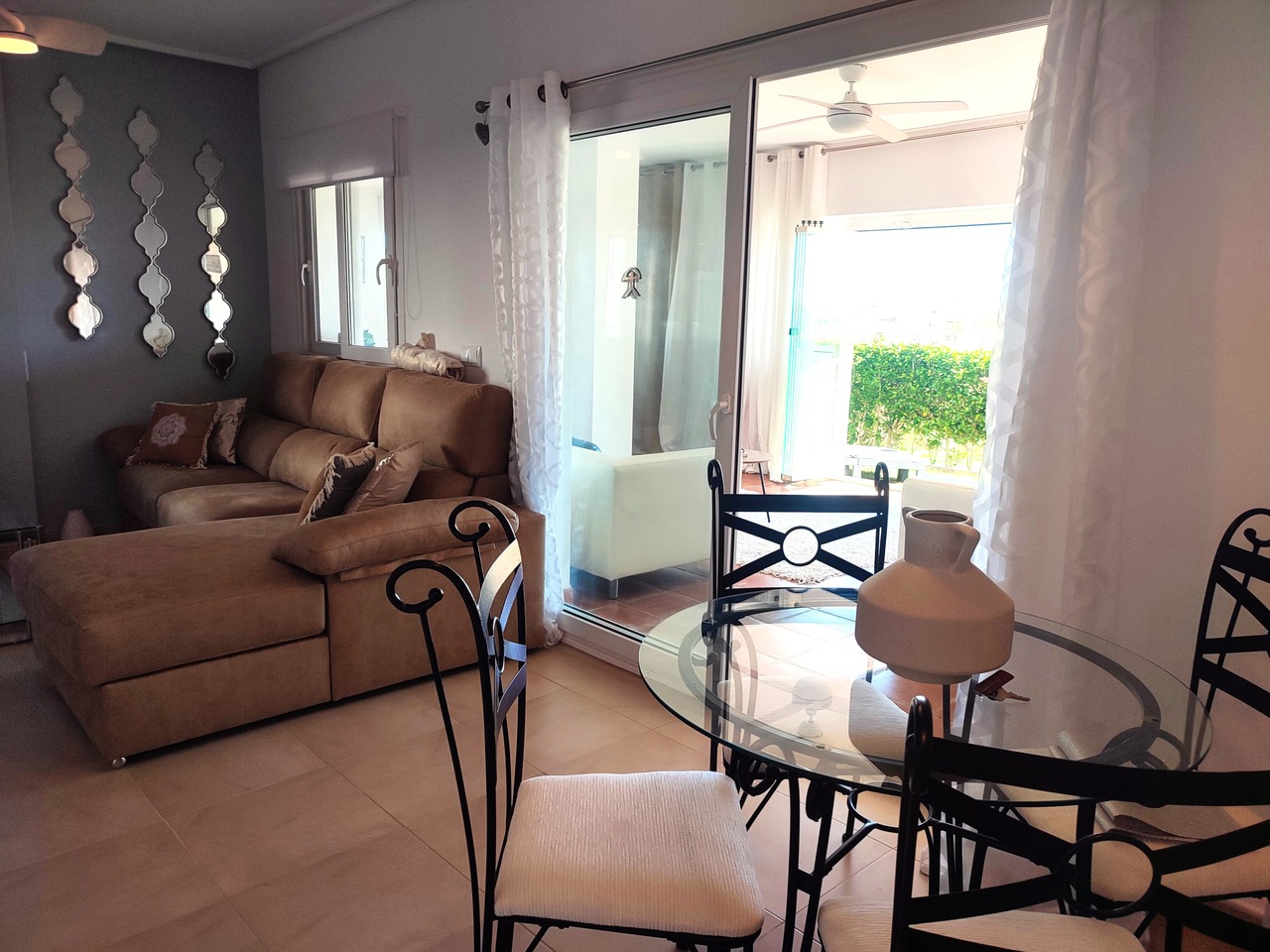 This sunny, well presented corner garden apartment offers one of the largest overall living spaces available on Hacienda Riquelme with the addition of the covered terrace with glass curtains that leads out to the private garden. Being a corned apartment this apartment is very light and airy with an extra window in the living room and also has a window in the good sized bathroom.This popular curved wall design apartment already has the largest kitchen of the apartments on the development and has the added benefit of easily being made opened planned if required.The property has air-conditioning in the living room for summer and central heating fthroughout for the cooler winter months, plus ceiling fans throughout. There is allocated underground parking with elevator to all levels. The apartment is being sold furnished minus personal possessions. It would make an excellent holiday home or suitable for permanent living.The first thing that impresses you about Hacienda Riquelme Golf Resort is the wide-open spaces, the extensive gardens and the low-density construction, which create a relaxing environment to enjoy a very safe and peaceful life or holiday. The apartments are set out spaciously around the magnificent and challenging 18 hole golf course part of the Jack Nicklaus Golf Trail. In the heart of the resort you will find the beautiful renovated Hacienda where you will find a supermarket, clubhouse, restaurant and bar. The inner court yard becomes the hive of entertainment in the Summer, whilst the large terrace set in the stunning gardens is open all year for “al fesco” dining and drinking.Facilities:Gated Community.24 hour security.“El Cason” Bar, Restaurant, Clubhouse. “Sips” Coffee ShopSupermarket.Summer Entertainment.19 large community swimming pools.Communal gardens.Trees, 5 lakes.Wild flowers & local wildlife.Driving range & Golf ShopTennis courts.Paddle tennis courts.Football / Basketball court.Outside gym area.Children’s play areas.Hacienda Riquelme is very well connected by the main motorways. Murcia Airport (20 mins)Mar Menor beaches (15 mins)Mediterranean beaches (20 mins)For those who like historical buildings, architecture or a desire to shop, the lovely cities of Murcia and Cartagena provide plenty of entertainment. Murcia (30 mins)Cartagena (45 mins) Murcia Airport (20 mins)Near to the bustling popular village of Sucina with shops, restaurants, bars, chemist, supermarket and lots more (5 minutes)
