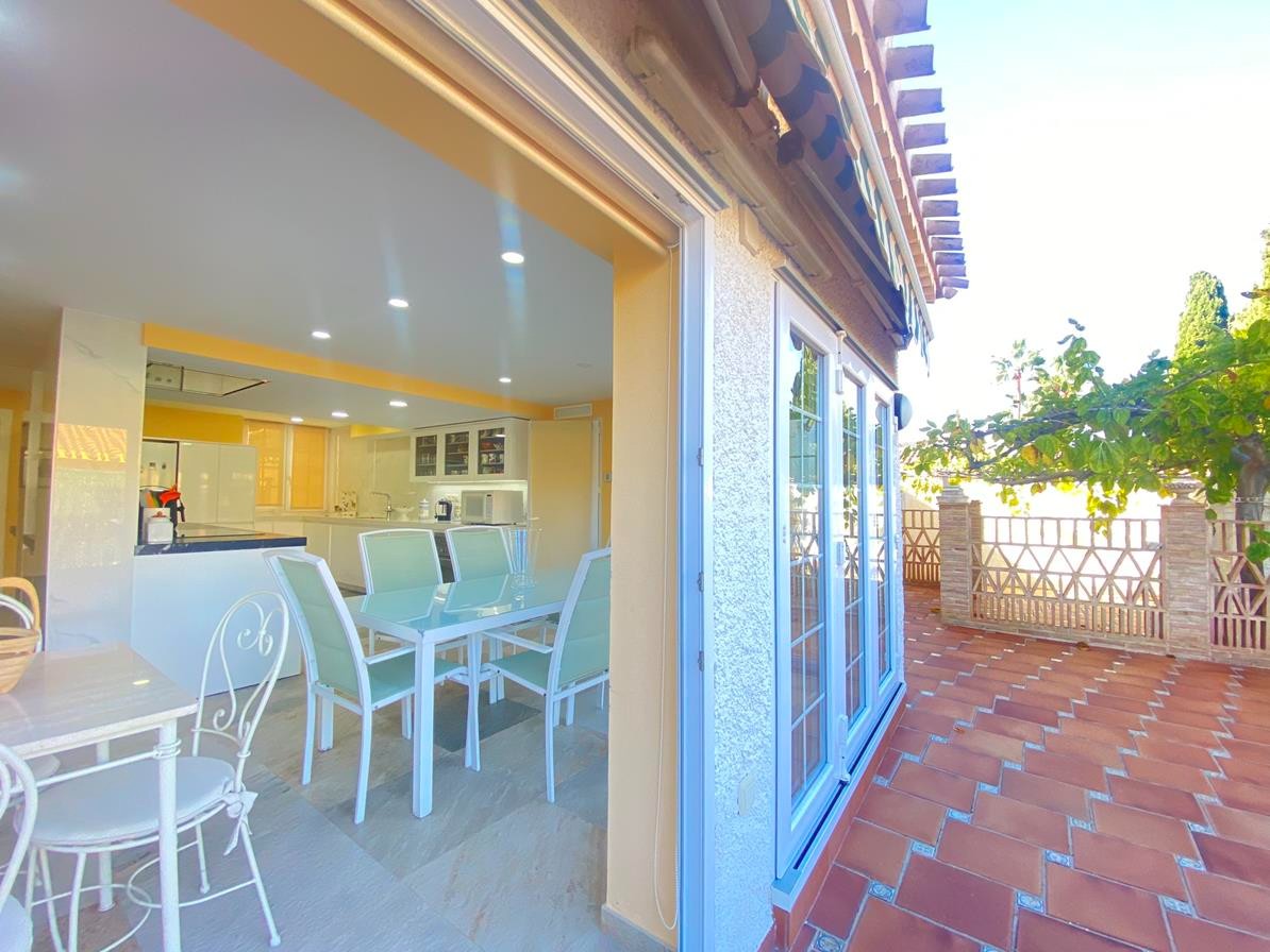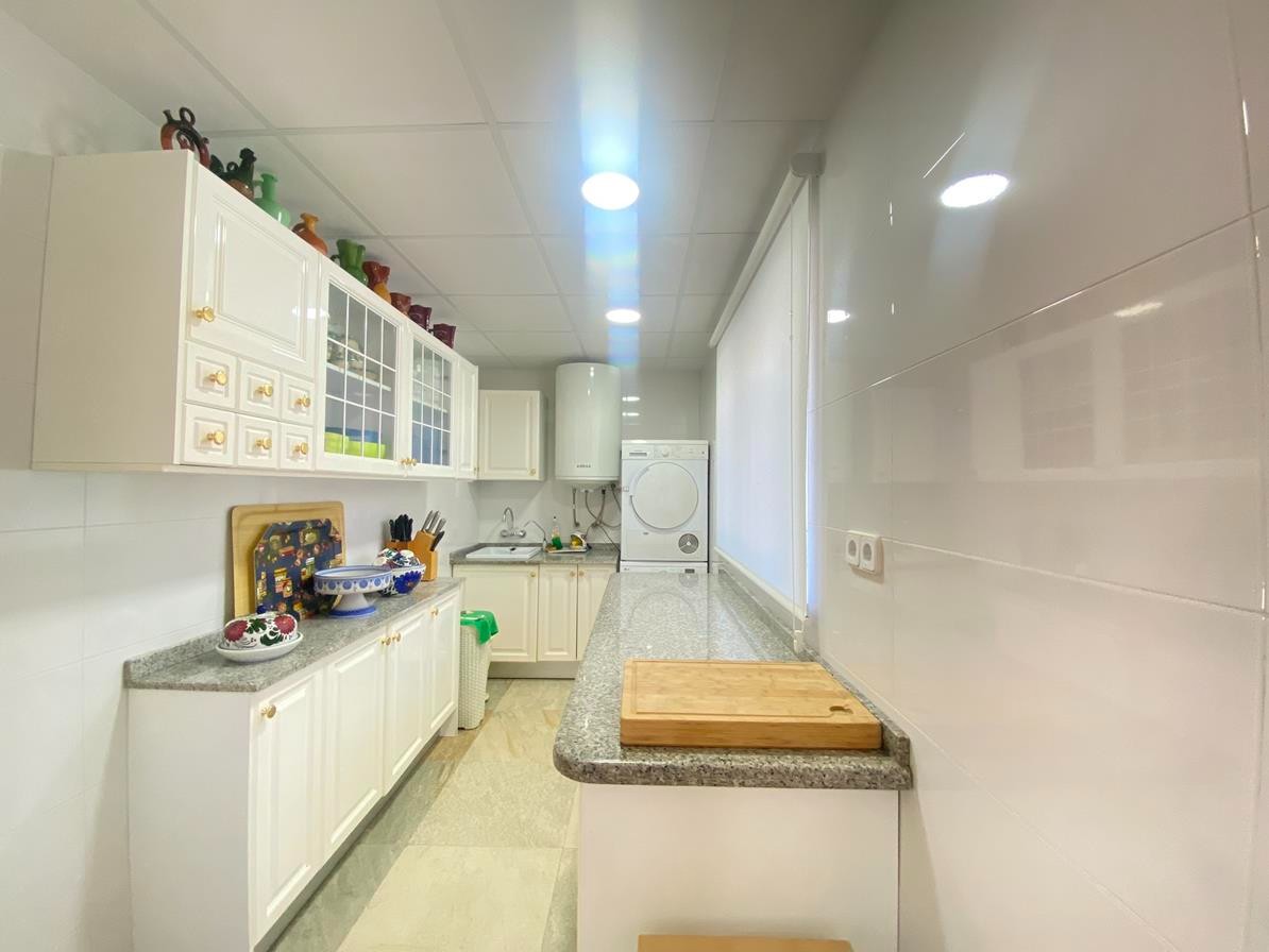 The fully renovated kitchen is another of the main attractions of this villa. With a modern and functional design, it features a large central island, plenty of storage space and a dining area. In addition, from the kitchen there is access to a large back patio, ideal for al fresco dining, as well as a pantry and the private garage.