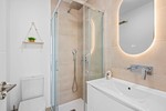 The penthouse offers two bedrooms and two bathrooms and features a practical layout with an open living area and kitchen that creates a bright and comfortable atmosphere. From the living room you have access to the terrace overlooking the inner garden and the communal swimming pool.
