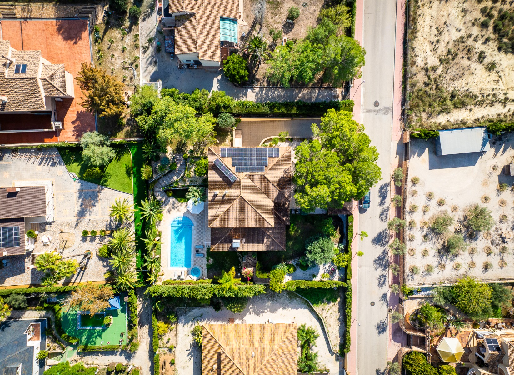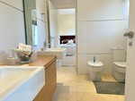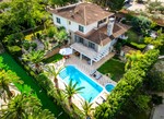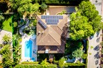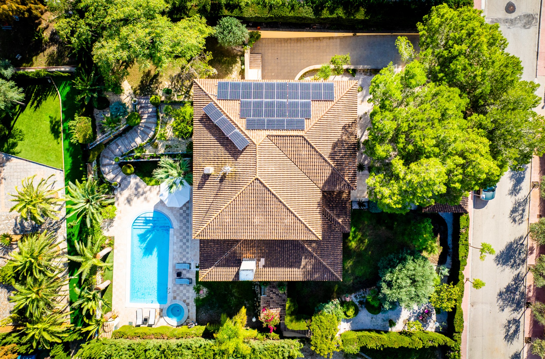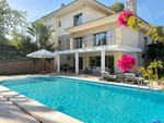 Set within a beautifully landscaped 1,800 m² plot, the gardens feature mature pine and palm trees, manicured lawns, and Mediterranean planting that ensures year-round tranquility and privacy. The outdoor living area centers around a 12 m x 5 m overflow pool with integrated spa, surrounded by elegant terraces ideal for relaxation or entertaining. Exterior changing facilities with shower and toilet add convenience to this resort-style setting.
